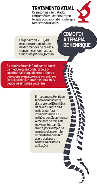 Na semana que vem, os hematologistas Adelson Alves e Elíseo Sekiya, de São Paulo, irão revelar aos cientistas reunidos no congresso mundial da Sociedade Internacional de Terapia Celular, a ser realizado entre 21 e 25 de abril, na Nova Zelândia, as conquistas obtidas pelo agrônomo Henrique Dias, 68 anos. Ele é o primeiro paciente brasileiro tratado com infusões de células-tronco que obteve uma melhora importante de alguns sintomas da Esclerose Lateral Amiotrófica (ELA). Degenerativa, a doença leva ao enfraquecimento muscular progressivo. Aos poucos, o paciente perde a capacidade de andar, falar e até de deglutir. Em geral, a morte ocorre três anos e meio após sua manifestação. O trabalho descrevendo o tratamento de Henrique será publicado na revista científica “Cytotherapy”.