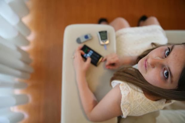 Rafaela Cassel, de 11 anos, utiliza o celular para ajudar no controle da diabetes.