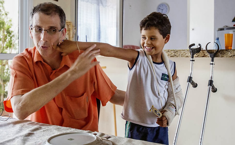 Nando Bolognesi com o filho, Leonardo, de oito anos, na casa da família em Itu