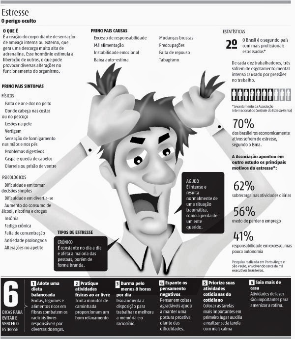 De acordo com a Associação Internacional do Controle do Estresse (Isma), estudos científicos comprovam que o nível de estresse e o estilo de vida determinam 60% das doenças. Mas as principais associadas ao mal são diabetes, depressão, enxaqueca e dislipidemias.