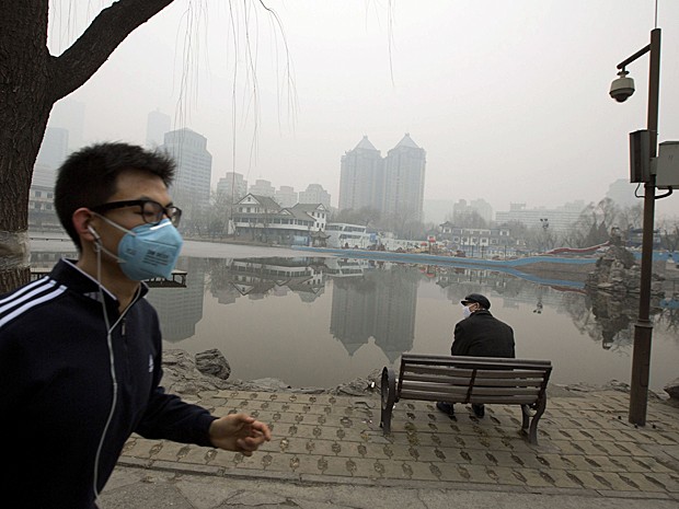 Homem faz exercício de máscara para se proteger da poluição em Pequim, na China